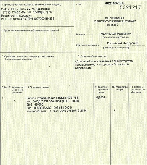 ОАО «НПП «Темп» им. Ф. Короткова» успешно завершило процедуру сертификации и получило сертификат СТ-1 на клапан стравливания воздуха КСВ-75В, документально подтверждающий его отечественное происхождение.